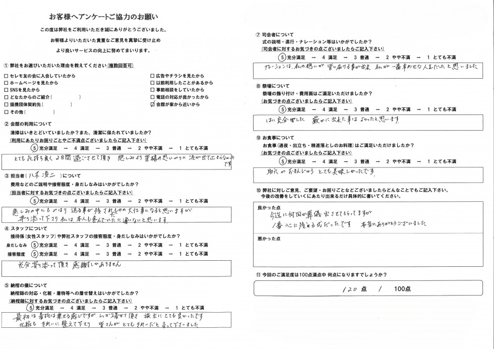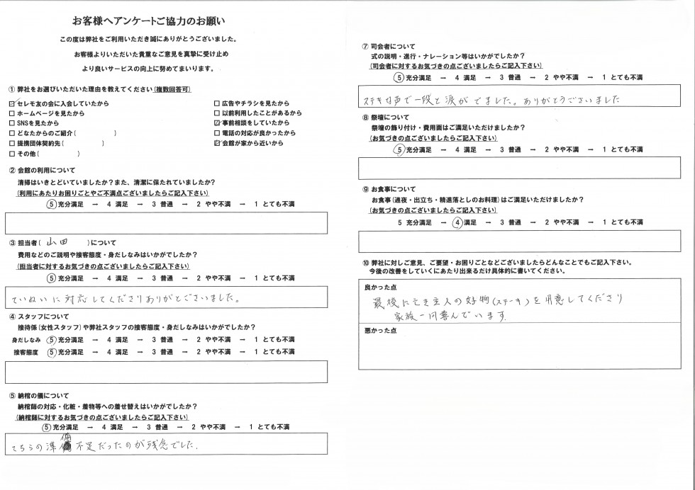 無知な我々にたくさんの事を教えてくださり、とても分かりやすかったですし、満足のいく葬儀にできた事感謝の気持ちでいっぱいです。
